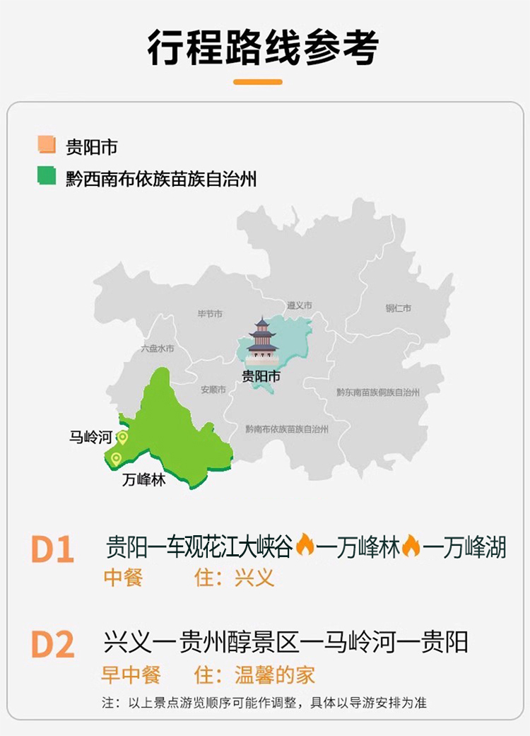 集合地址:贵阳市云岩区延安西路旅游集散市中心集合 集合详情:早上 07:30左右于贵阳市云岩区集合,乘车赴兴义(具体出发时间以出行前一天导游通知为准)。