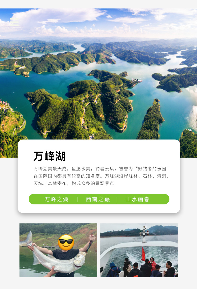 随后前往游览贵州高原第一大湖该湖是因为在广西和贵州交界的南盘江修建天生桥水电站而形成。原名为天生桥水库,因为处于兴义的峰林地带,因此取名万峰湖。