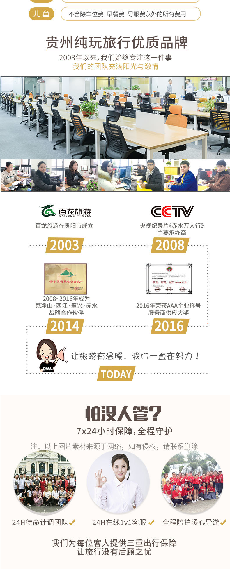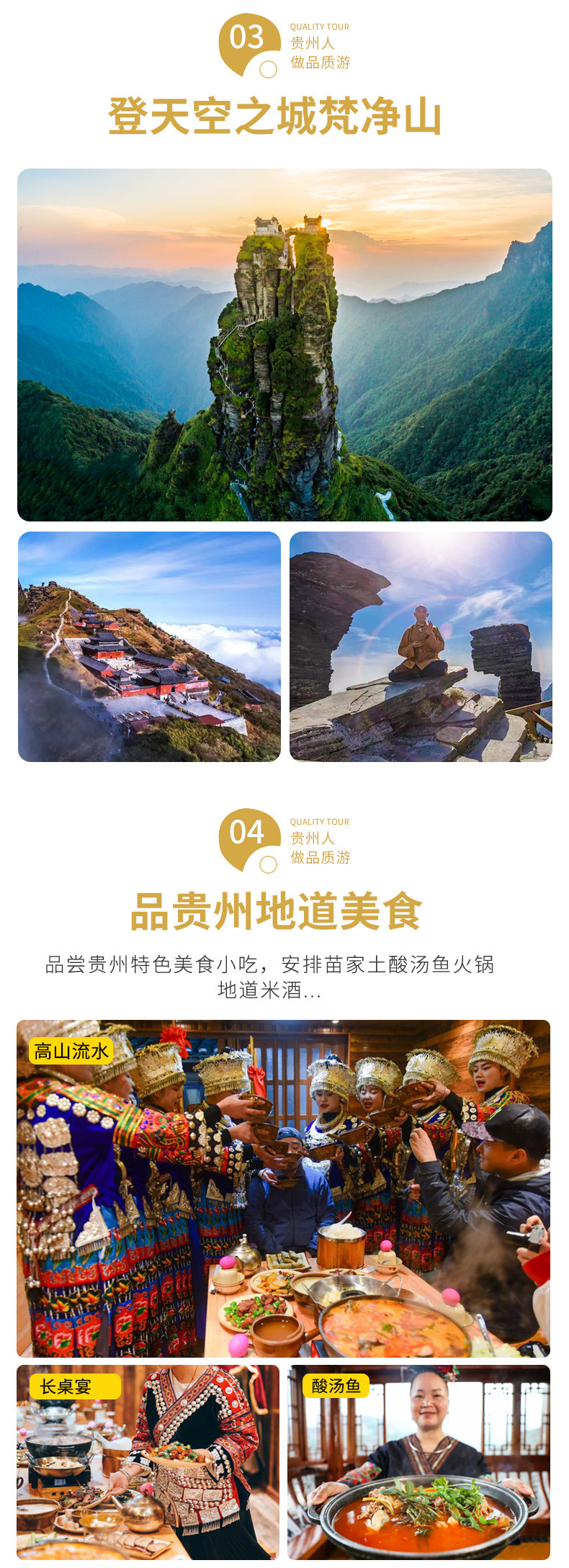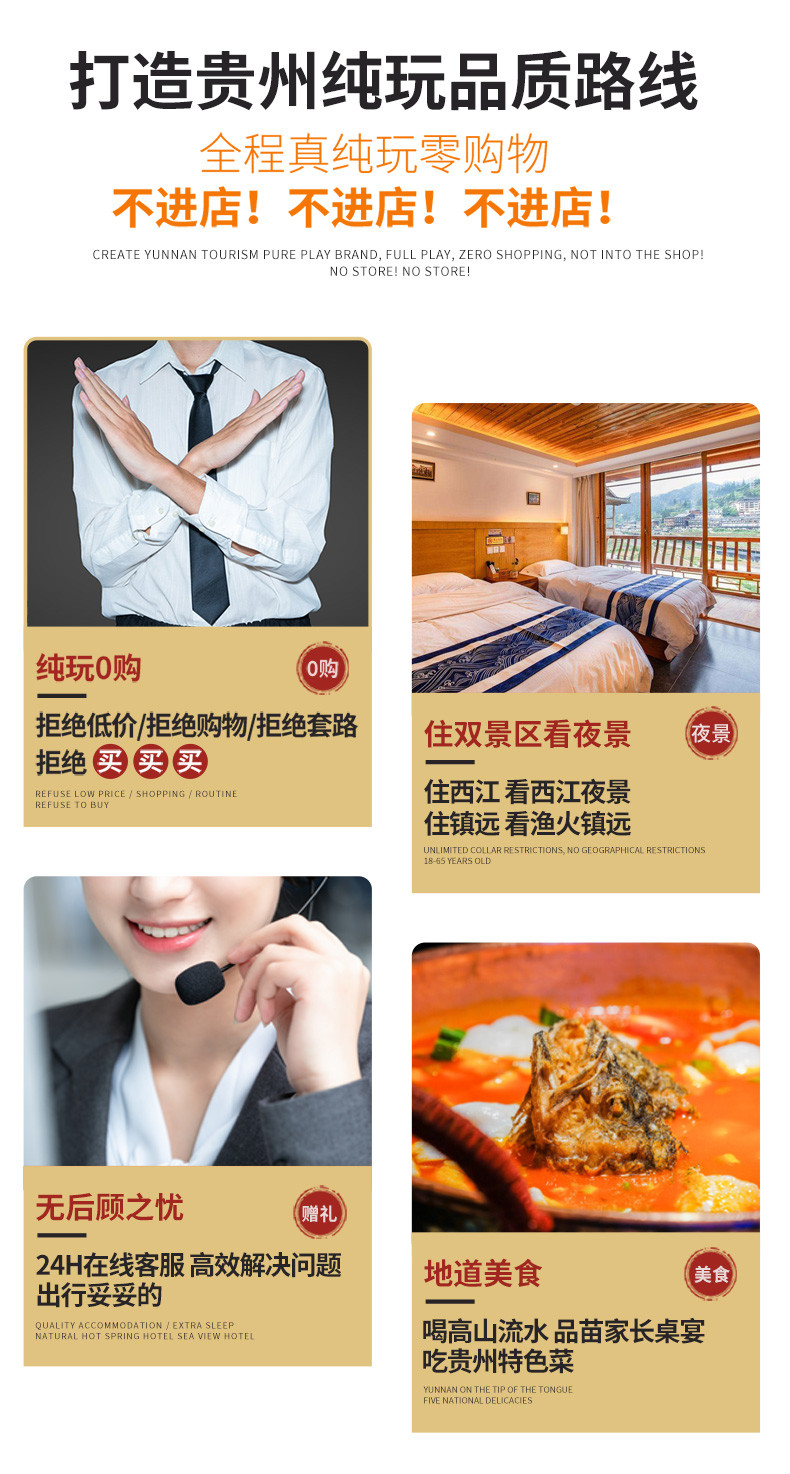 【服务保障】贵州省本土旅行社、无中间商赚差价,信誉保障24小时客服在线服务 全程0购物0自费(景区的小交通除外)充足的浏览时间全程持证优秀导游服务 无任何套路,纯玩执行到底,如进店赔付1000元,品质保证,不走回头路,环线设计。