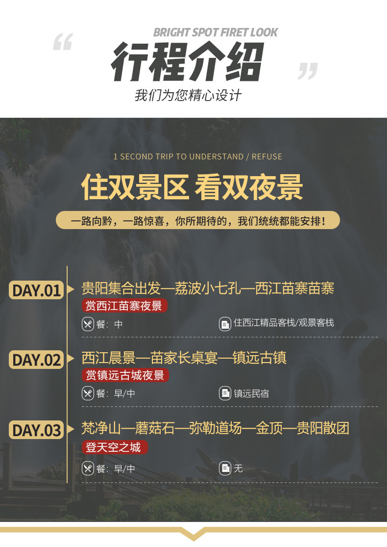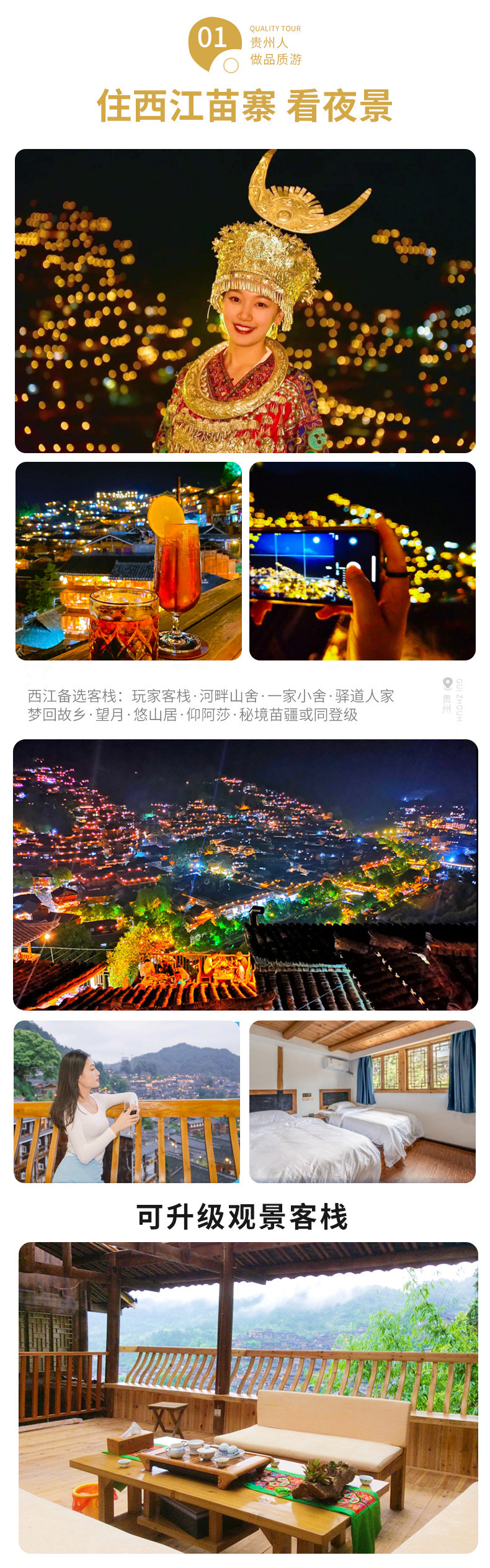 【度假圣地】酒店多标准,满足您的不同需求,可升级观景客栈,保证入住西江千户苗寨景区内经典3日游线路、地球上的的绿宝石荔波小七孔,畅游醉美的西江千户苗寨和镇远的夜景,天空之城梵净山车型可升级29人头等舱2+1车型安全舒心游