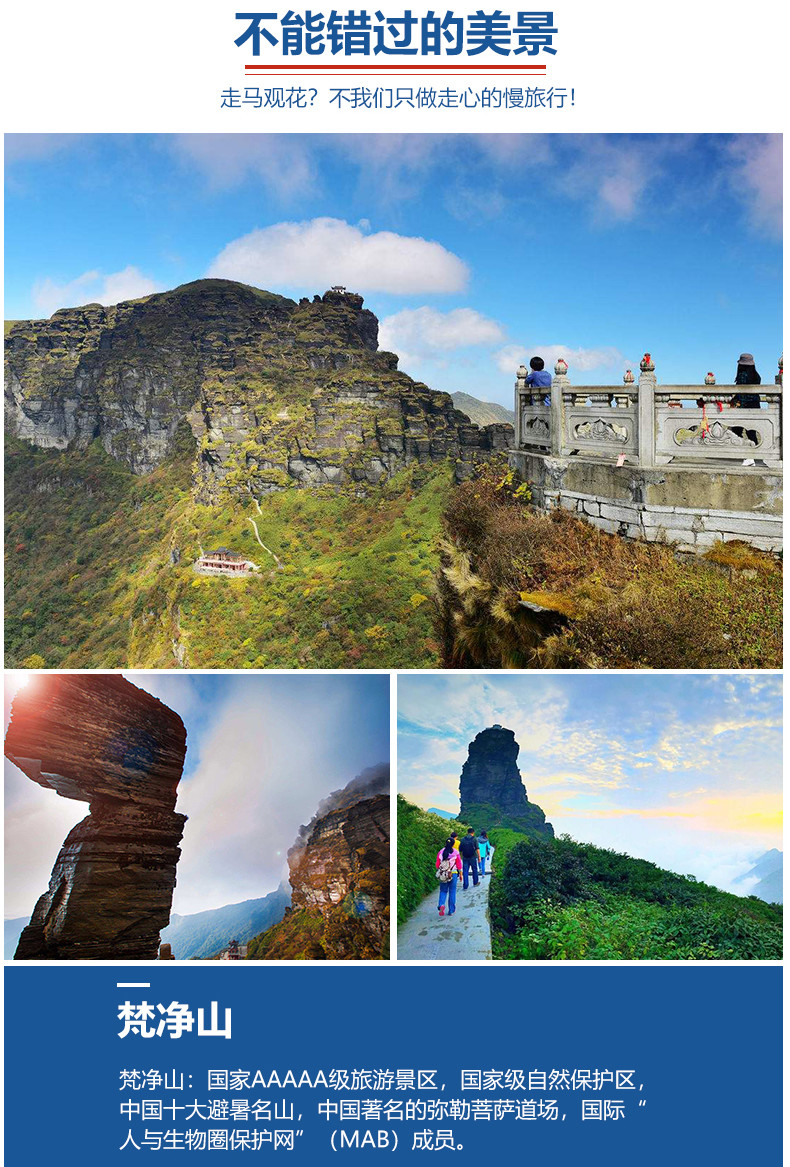 餐后登世界自然遗产地,5A级景区,国家自然保护区,、佛教名山、弥勒道场梵净山(不含索道往返140元/人,环保车48元/人,景区保险10元/人,必须自理),经东线上山攀登高94米的佛教胜地金顶。