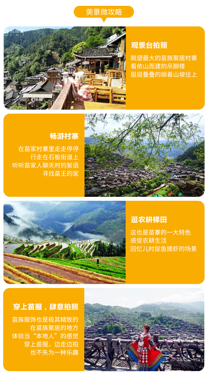 到达景区后乘坐景区观光车直奔表演场观看西江景区免费安排的当地民族歌舞表演; 温馨提示: 因此表演为免费,如遇下雨、国丧、政府行为、场地维修等则会取消表演,无费用可退,敬请理解