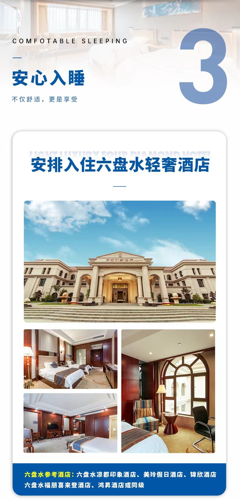 六盘水安排:美玲假日酒店、凉都印象酒店、锦欣酒店、鸿昇酒店或同等级酒店