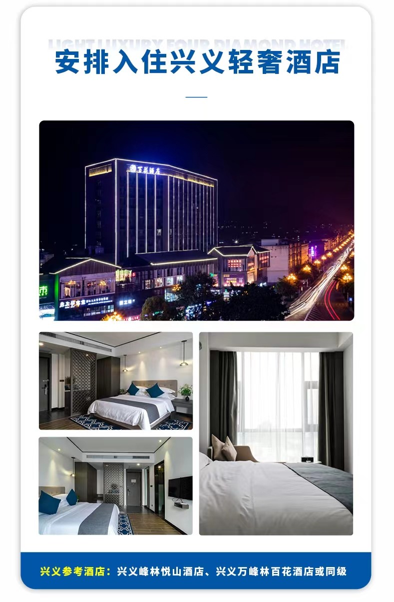 兴义安排:兴义峰林悦山酒店、万峰林百花酒店、兴义地标国际酒店或同等级酒店