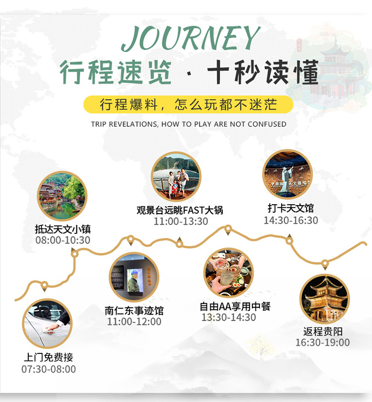 07:30-08:00 酒店依次接客人出发:住在贵阳市3环内免费接送,出发前一天告知酒店信息,出行当天到酒店门口接您,出发前一天司机师傅也会联系您,注意保持电话畅通