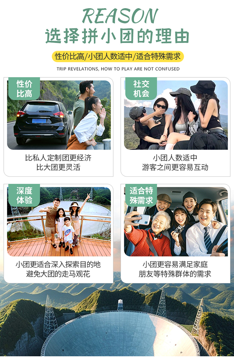 拼小团的接车顺序是根据当天参团客人的酒店顺序顺路接,行程中的座位是随机的,保证一人一正位,不接受指定座位,敬请理解知悉!