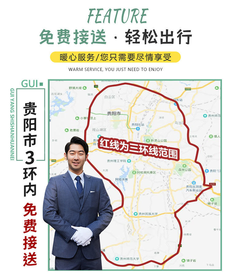 赠送贵阳3环免费接送,超出区域需加收80-100元/趟的接驳费用。
