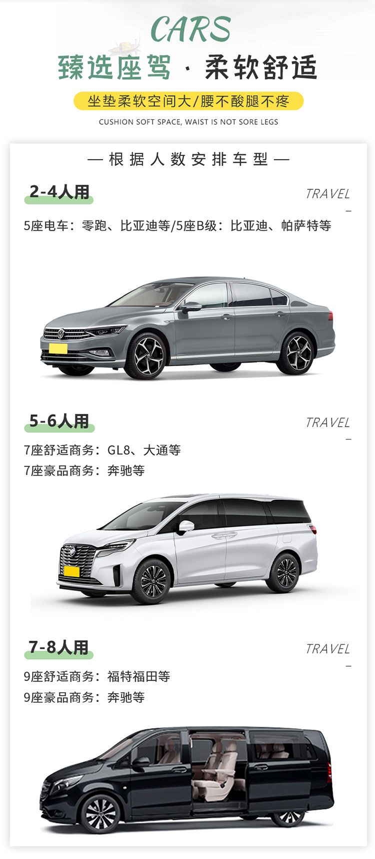 根据人数安排车型,根据人数安排车型,2-4人5座、5-6人7座、7-8人9座。