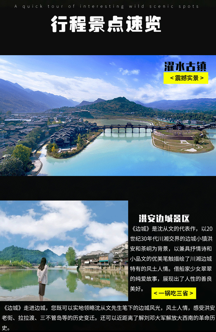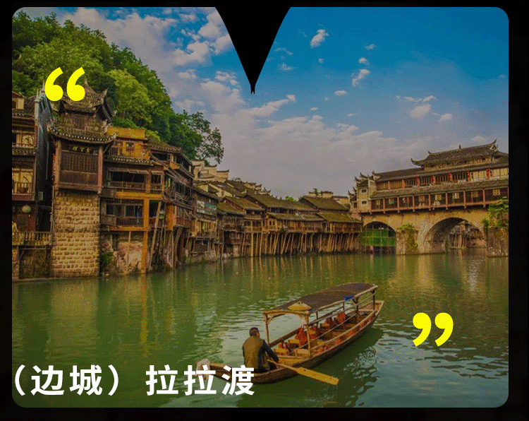 《边城》中,有这样一段描述:若从百年前某较旧的地图上寻找,可有黔北、川东、湘西一处极偏僻角隅上,发现一个名为镇竿的小点,事实上应有一个城市,在城市里,安顿下三五千人蒙有一层神秘面纱的古城凤凰。