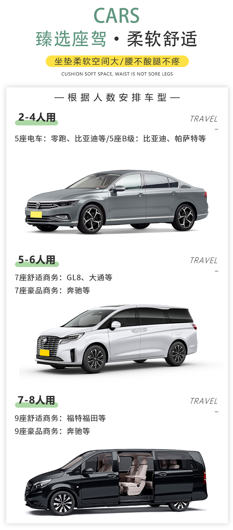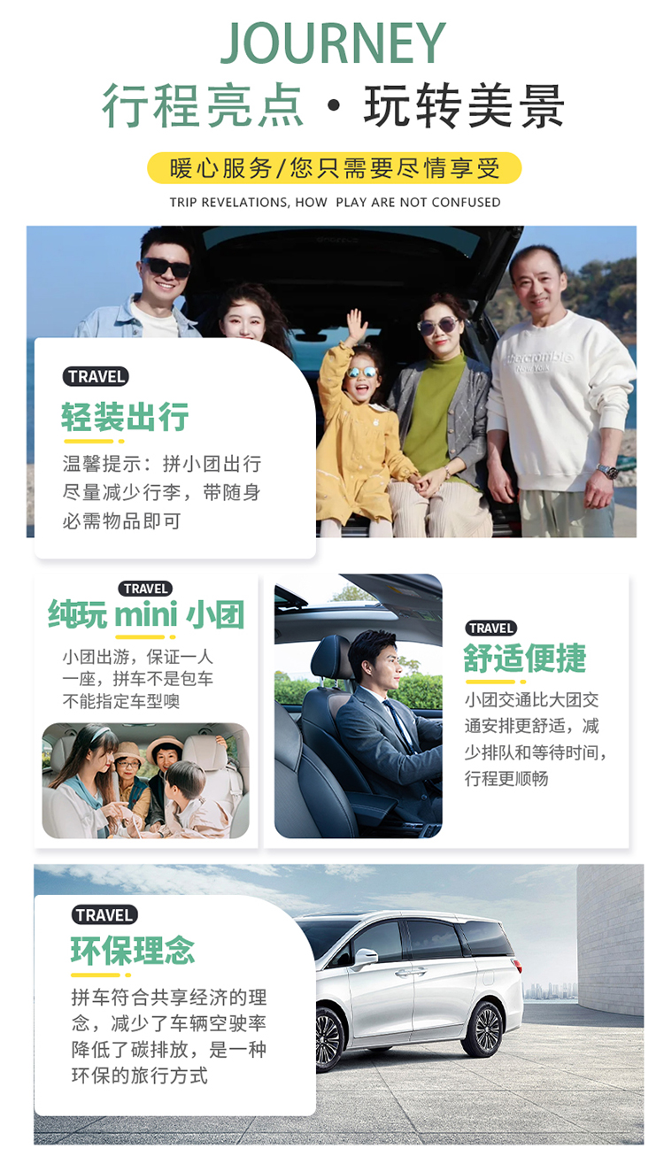 拼小团的接车顺序是根据当天参团客人的酒店顺序顺路接,行程中的座位是随机的,保证一人一正位,不接受指定座位,敬请理解知悉!