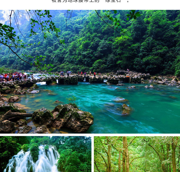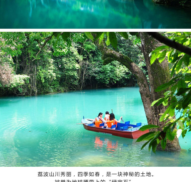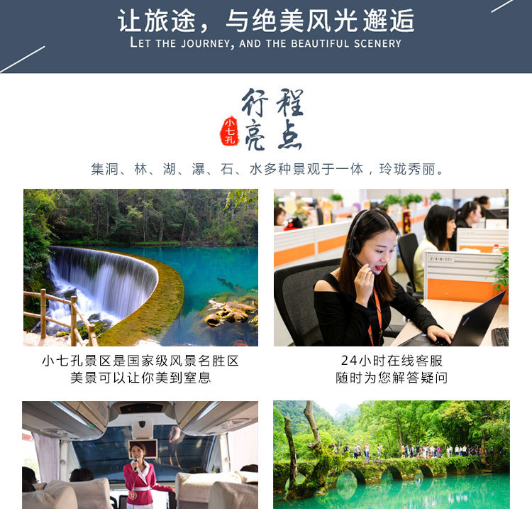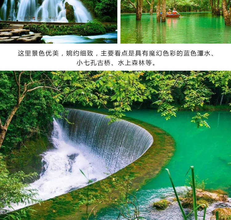 乘空调旅游车经夏蓉高速公路(车程约3.5小时)到达中国最美丽的地方,贵州第一个世界自然遗产地荔波,中餐后,乘车(约15分钟)抵达【小七孔景区】:景区内换乘电瓶车 (费用不含:电瓶40元/人、景区保险10元/人、共计50元客人自理)游览卧龙潭、鸳鸯湖(游船自愿自理30元/人,此项目为景区内不必须消费项目)、翠谷瀑布、水上森林、六十八级跌水瀑布、拉雅瀑布、距今175年的小七孔古桥、以及通往广西的铜鼓桥(全程游览约4小时),随后乘车返回,约20:00左右到达贵阳(已具体抵达时间为准),结束愉快的荔波小七孔之旅! 注:1.行程时间为参考时间,具体以实际发生为准。 2.为便于散客中心通知游客的乘车时间及上车地点、导游和车牌号,请游客在出行前一天随时保持手机畅通。 3.行程、景点游览顺序、游览时间仅提供参考标准,具体视景区情况或导游安排实际游览顺序而定。