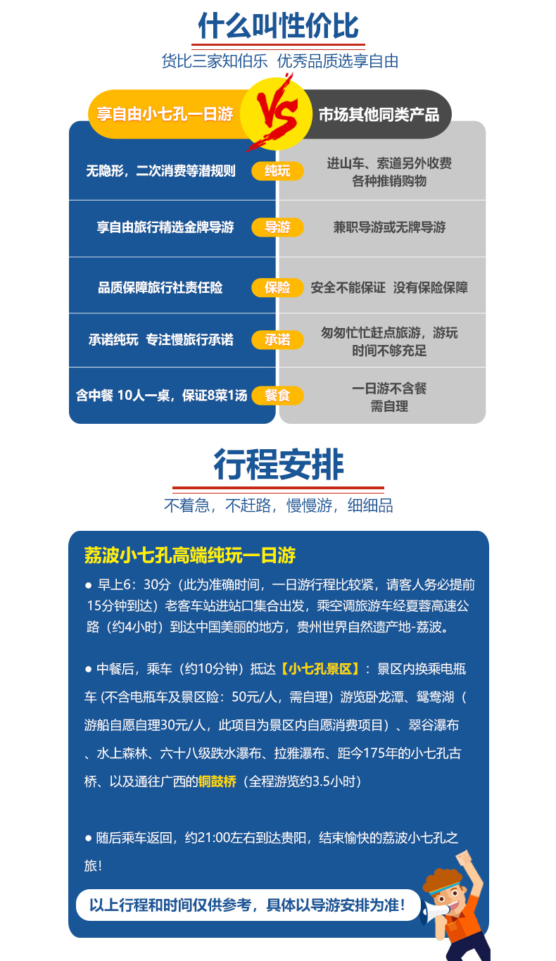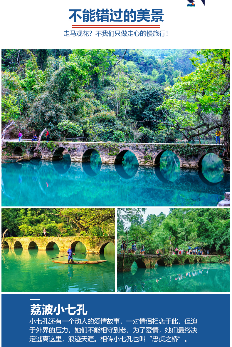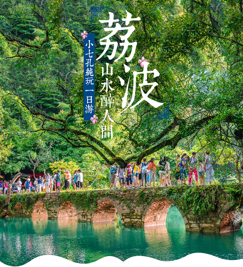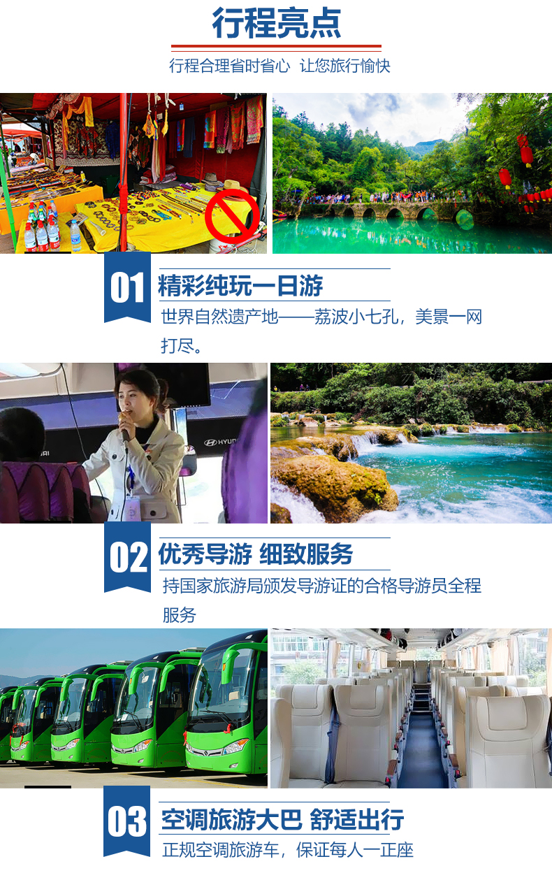 早上6:30分(此为准确时间,一日游行程比较紧,请客人务必提前15分钟到达)贵阳延安西路老客车站集合出发,乘空调旅游车经夏蓉高速公路(约4小时)到达中国最美丽的地方,贵州第一个世界自然遗产地荔波,中餐后,乘车(约10分钟)抵达【小七孔景区】:景区内换乘电瓶车 (不含电瓶车及保险计:50元/人,需自理)游览卧龙潭、鸳鸯湖(游船自愿自理30元/人,此项目为景区内不必须消费项目)、翠谷瀑布、水上森林、六十八级跌水瀑布、拉雅瀑布、距今175年的小七孔古桥、以及通往广西的铜鼓桥(全程游览约3.5小时),随后乘车返回,约21:00左右到达贵阳,结束愉快的荔波小七孔之旅!