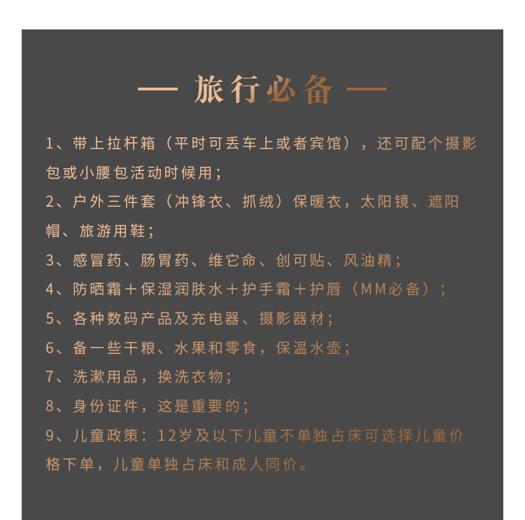 儿童费用含全程车费、保险、司机补贴及组织成本费等。不含门票及住宿。儿童如需占床需补单房差,门票、早餐超高需自理。