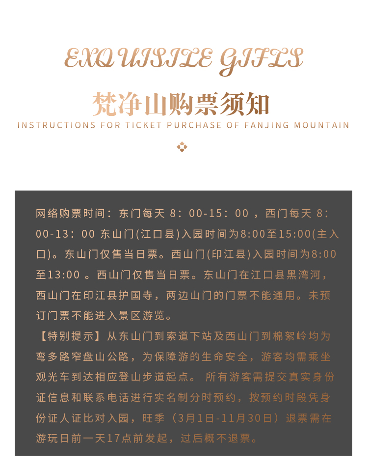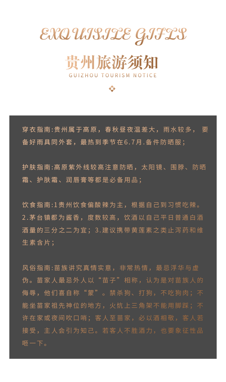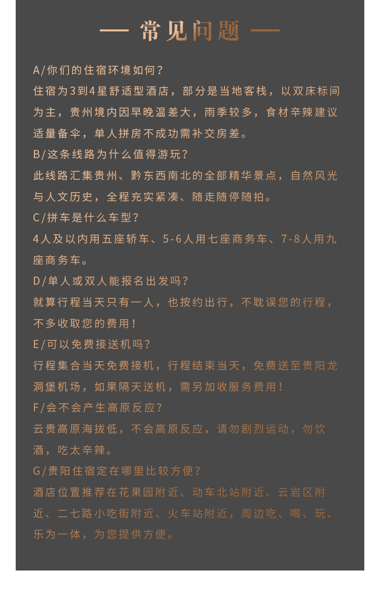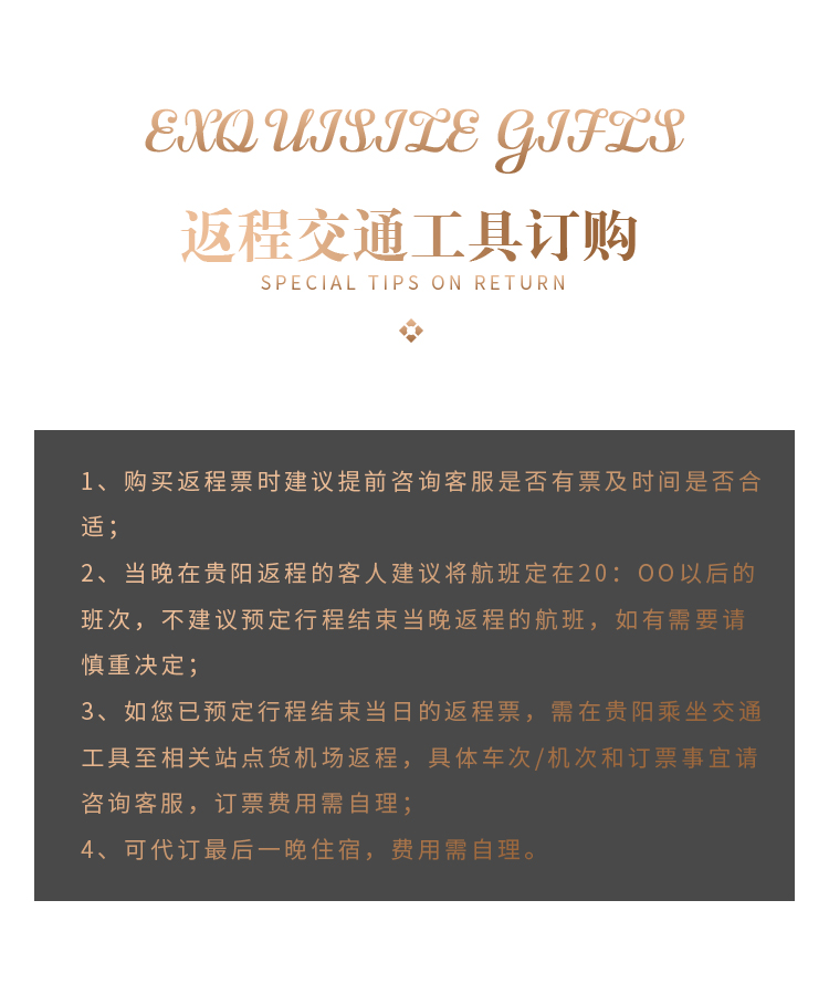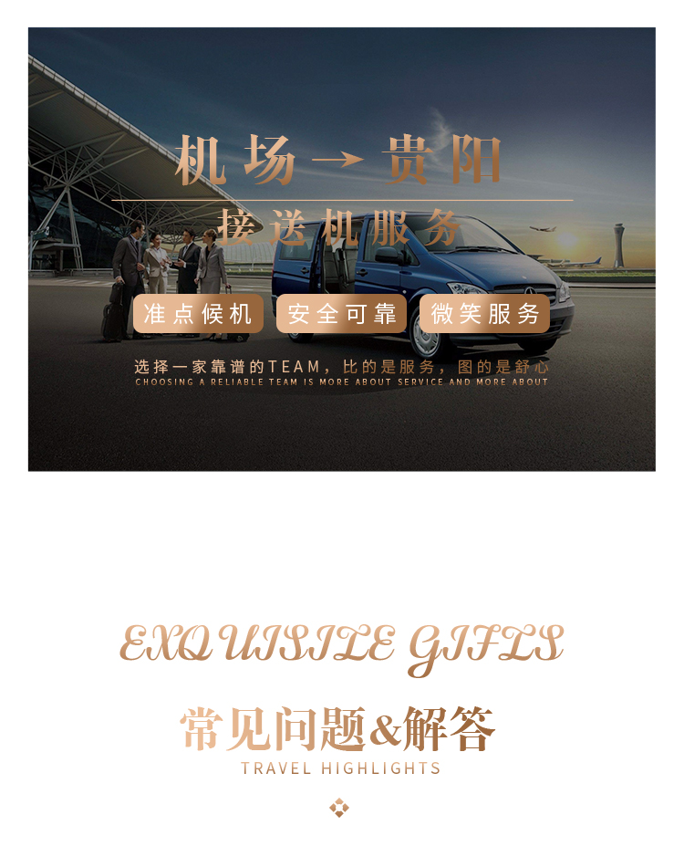 接送:接送机:贵阳龙洞堡机场和火车站动车站均安排接送机服务,由专业接送小组贴心服务。(接送机为轮席时间发车,我们会根据您的航班时间安排车次,等待时间为1小时。如您航班晚点或取消请及时联系您的客服。)接机是赠送服务不接送无费用可退。