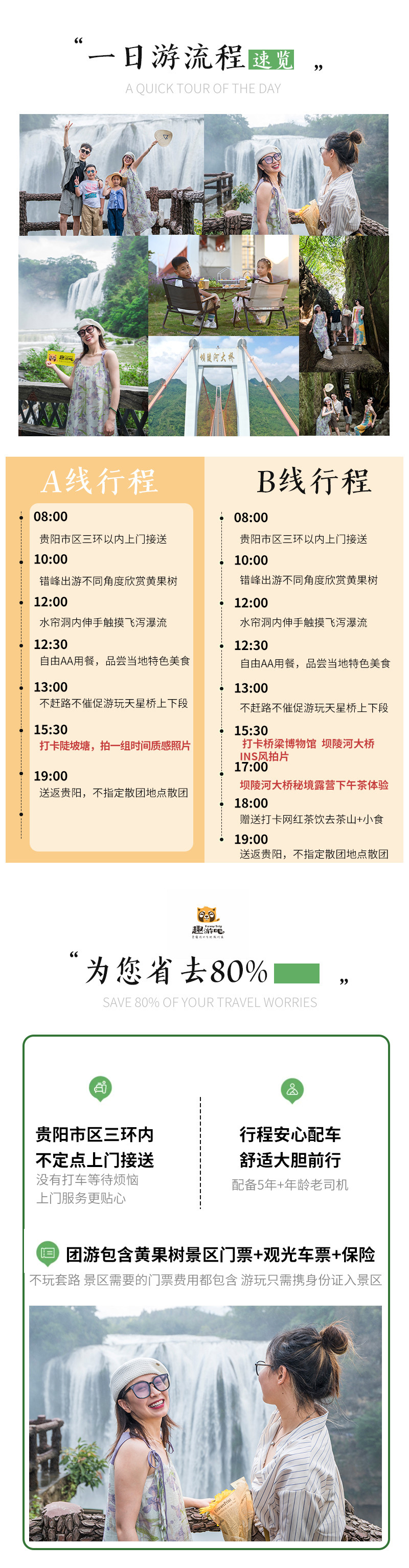 3.备注:黄果树门票需提前订票,持以上优惠证件的请提前报备,持景区认可优惠证件享部分门票优惠退费。