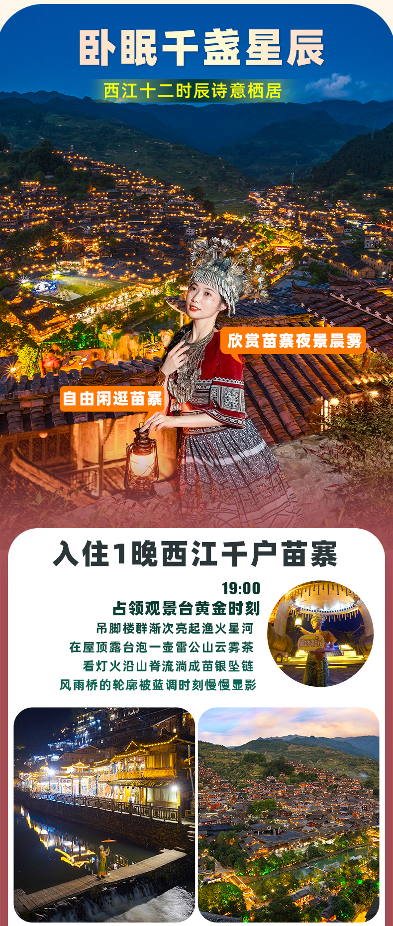 晚上可自由前往一号风雨桥观光车乘车点乘车前往观景台,俯瞰【西江千户苗寨夜景】,夜幕降临,千万盏星灯亮起,星星点点,甚是壮观,之后自由活动,返回酒店休息。