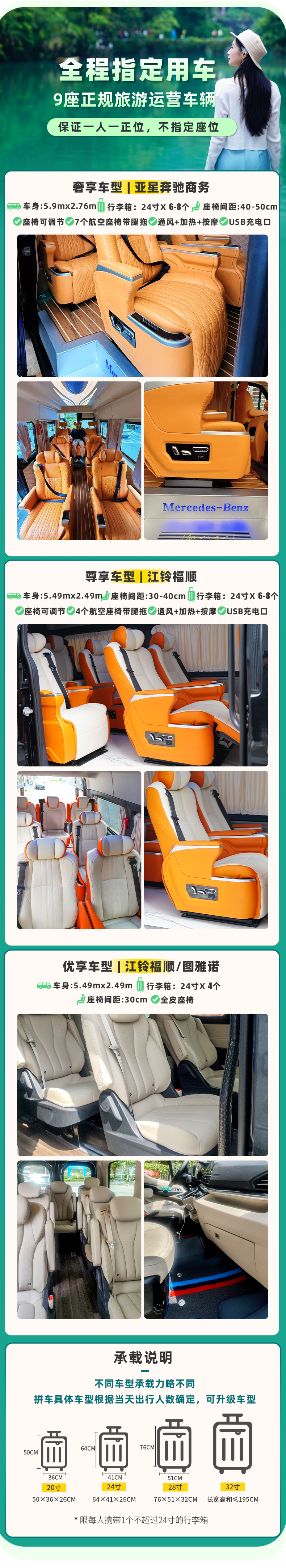 根据参团人数调派车型,保证一人一正座
