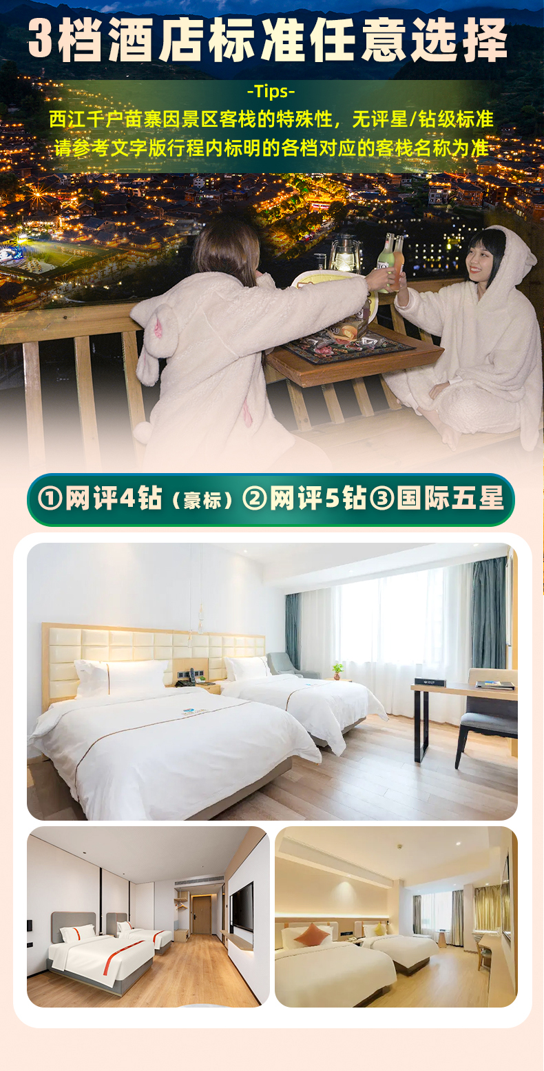 今日入住苗寨内参考客栈(入住客栈内观景房): 归隐楠舍(观景房)/西子花园别院(观景房)/半山居舍(观景房)/南山假日(观景房)/印象西江(观景房)/鸾喜寒舍(观景房)/ 西江山也渡酒店 A 栋(观景房)/西江屿念伴山度酒店(观景房); 温馨提示: 如遇政府征用、旺季房满等情况,将安排不低于原档次的其他酒店,敬请理解; 1.景区苗寨客栈住宿,客栈规模均较小,住宿无法与市区酒店对比,敬请理解; 2.贵州多雨雾天气,西江苗寨坐落在山涧,所以房间会有潮润的情况; 3.西江均为民俗客栈,空调,热水器均具备,但是和城市同等级别的酒店有差距。且单家客栈房间数量较少,一个团可能会出现分1-2家客栈住宿,进入景区无行李车,需要自行携带行李步行进入景区入住酒店(建议将大件行李存放车上,仅携带贵重物品以及必备洗漱品进入景区) 4.以上为今日住宿参考酒店,不单独指定住宿酒店,旅游社统一安排住宿酒店,敬请理解; 5.报名房间默认安排双人标间,如需大床房游客,敬请下单时页面告知客服安排,酒店有大床房时优先安排大床房,敬请理解; 6.由于西江地区条件所限,今日酒店非网评 4 钻,为精选精品观景房型;