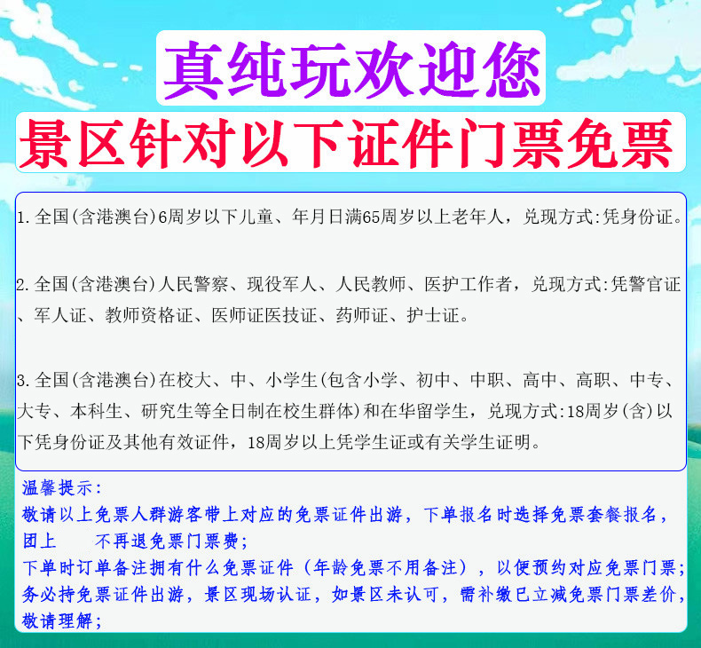 敬请以上免票人群游客带上对应的免票证件(原件)出游,景区现场认证换取免票,页面下单时选择免票套餐报名,团上不再退免票差价;非免票人群,景区未认可或未带原件或免票证件非本人真实有效证件,不能进入景区,责任自理;