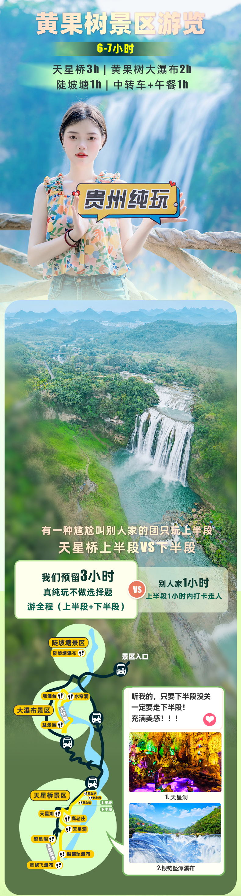 乘车前往黄果树景区(黄果树景区分为黄果树瀑布+天星桥+陡坡塘3个景点),贵阳到黄果树景区车程约2-2.5小时左右; 温馨提示:旺季或者节假日期间,因景区门票限量限流,可能会提前半小时左右出发,敬请理解 温馨提示: 由于水帘洞当天预约上限为1.1万人,旺季及重大节假日旅行社无法预约水帘洞 , 如有想去水帘洞的游客敬请自行预约;其他时间统一定票时,尽最大努力预约,如未约上,则不能游览水帘洞,也可报名时自行预约,可咨询在线客服;
