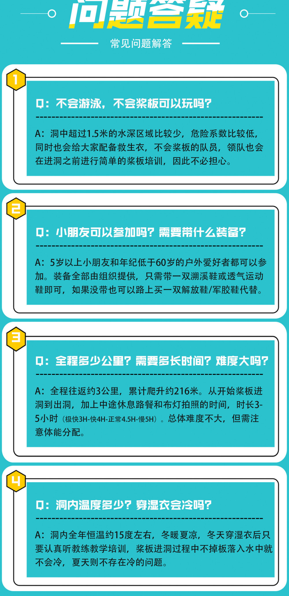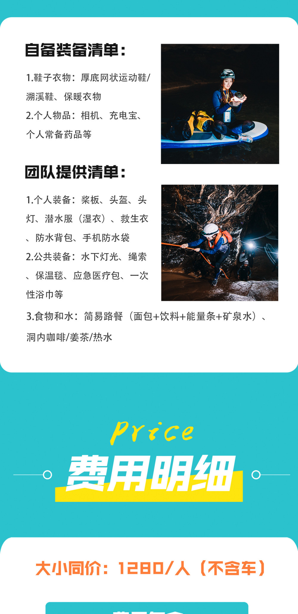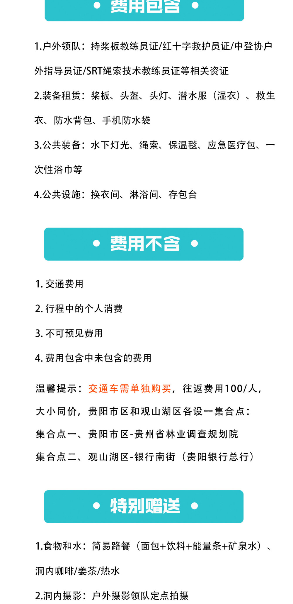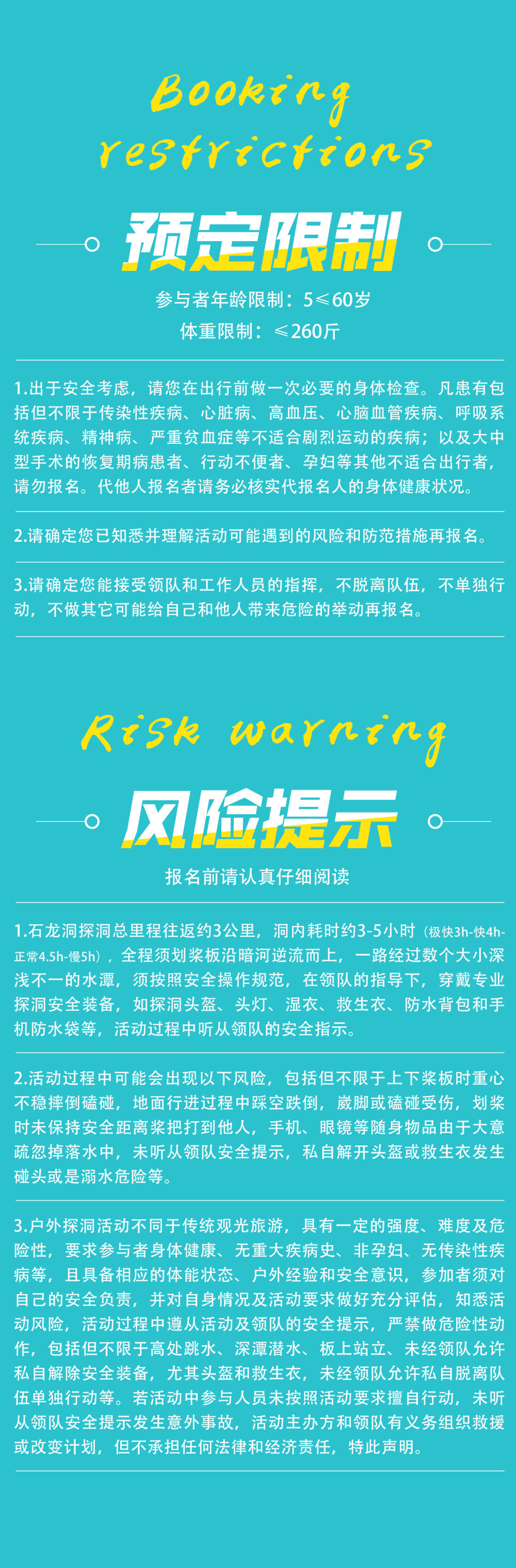 1.户外探洞活动不同于传统旅游,具有一定的危险性,要求参与者身体健康、无重大疾病史、非孕妇、无传染性疾病等,因此参加者须对自己的安全负责,对自身情况和活动要求做好充分评估,并充分告知客服自身身体状况,查看风险告知书 ,签署免责声明;如代他人报名请务必核实其情况;未成年人必须有监护人陪同方可参加活动,并有监护人对其负责。
