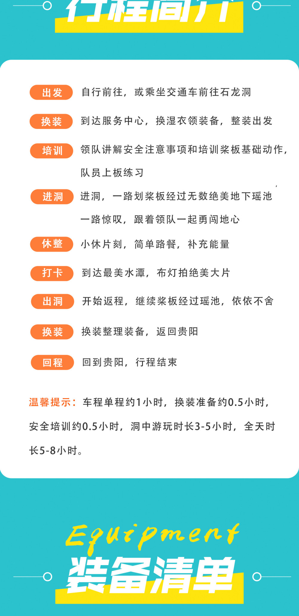 08:00贵阳酒店顺路接人出发 09:00前往花溪黄龙洞 10:00到达洞口服务中心,换湿衣,领装备,整装出发 10:20领队讲解安全注意事项和热身运动 10:30进洞,跟着领队一起勇闯地心 12:00小休片刻,简单路餐,补充能量 14:00返回洞口换装整理装备 14:20 前往陶咖喝一杯热咖啡/姜茶(选择自驾前往的套餐不含此项目) 16:00乘车返回责阳酒店