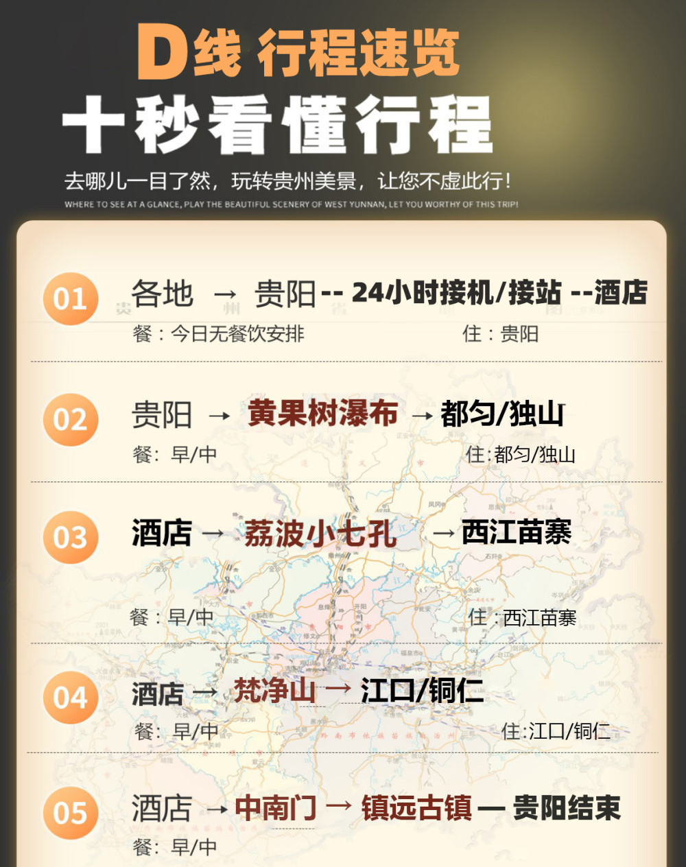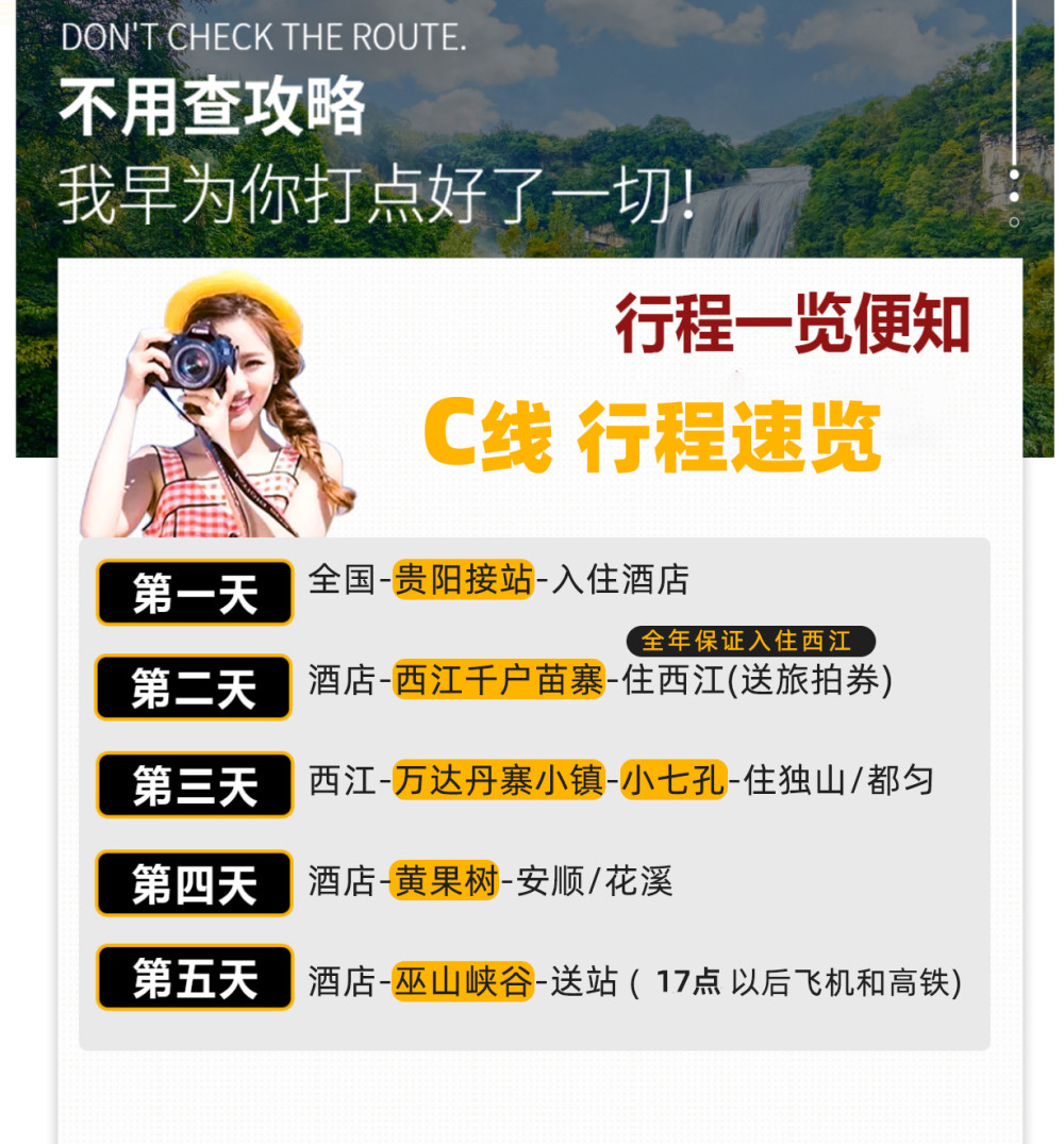 1、C线路一般是正常不堵车下午16左右到贵阳,可以送贵阳北站或机场,建议当天返程订17:30后贵阳北站的高铁,或18:30以后的机票,若当天不回就会在发团地点散团。 【节假日建议再推后半小时】(如路上因为交通事故、交通管制堵车,以及天气等不可抗拒因素造成大交通延误,我社不承担任何责任。)