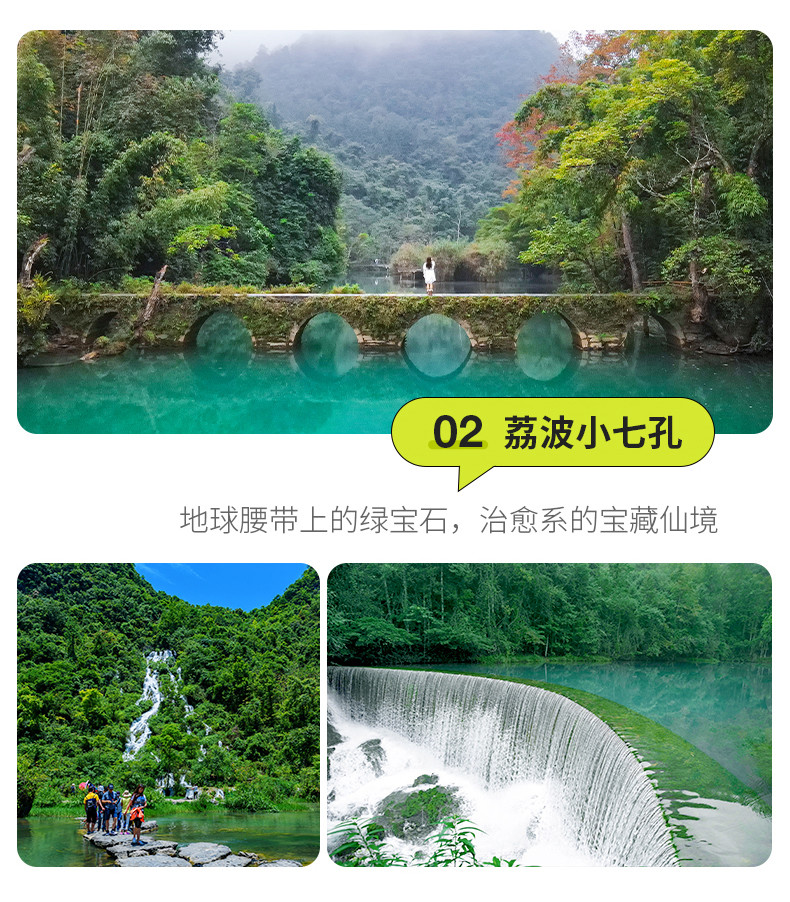 小七孔景区因一座建造于道光十五年间(1836年)的【小七孔石桥】而得名;景区被称之为超级盆景,集山、水、洞、林、湖、瀑布为一体,壮观而又秀美,水面经过吸收、反射和折射,呈现各种蓝色,美如仙境