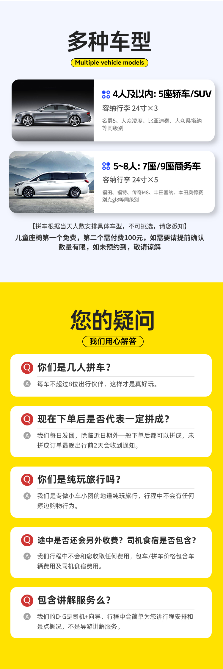 本团为2-8人小团,分为单拼车套餐和车+门票景交套餐,儿童费用仅为单拼车费用,超过1.2米,需要大人现场给儿童自理景区交通车费用