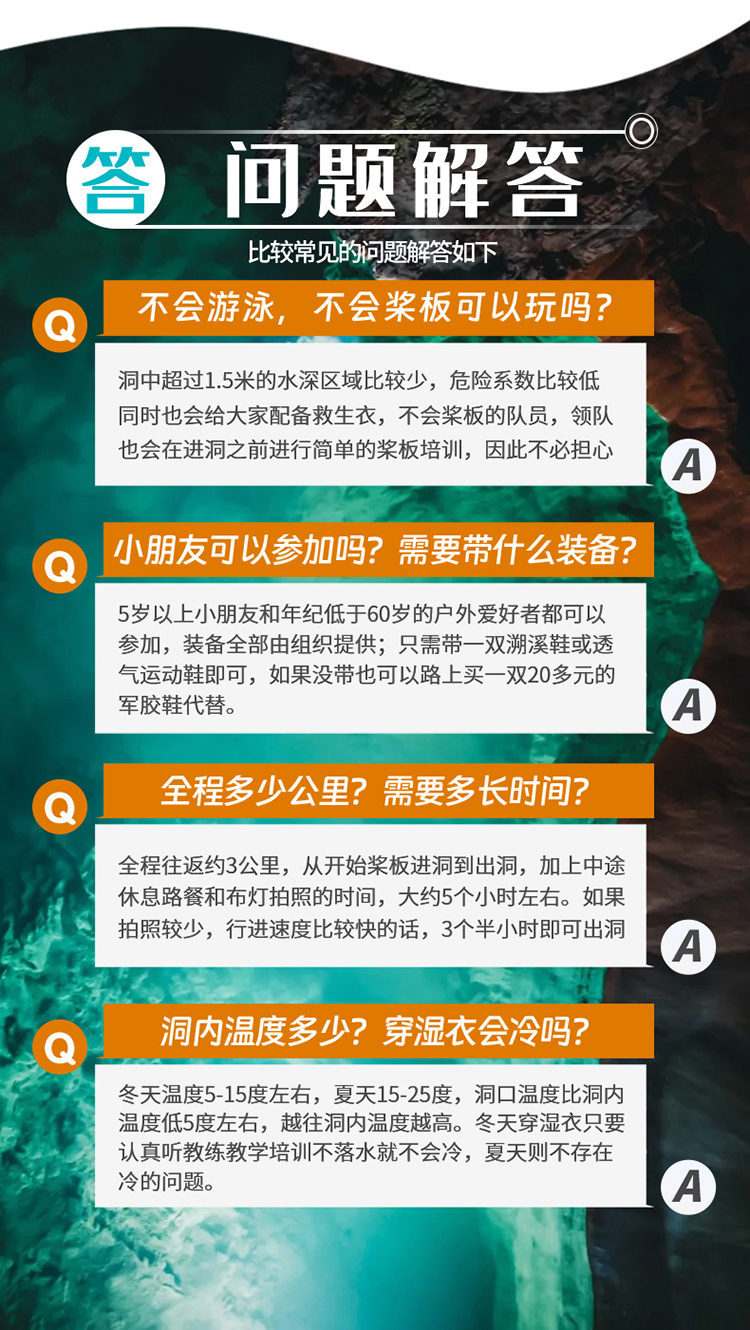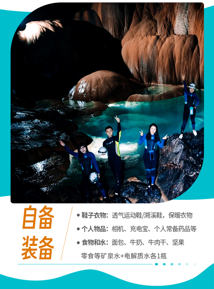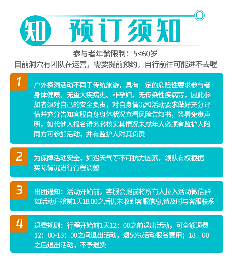 3、户外探洞活动不同于传统旅游,具有一定的危险性,要求参与者身体健康、无重大疾病史、非孕妇、无传染性疾病等,因此参加者须对自己的安全负责,对自身情况和活动要求做好充分评估,并充分告知客服自身身体状况,查看风险告知书,签署免责声明;如代他人报名请务必核实其情况;未成年人必须有监护人陪同方可参加活动,并有监护人对其负责。