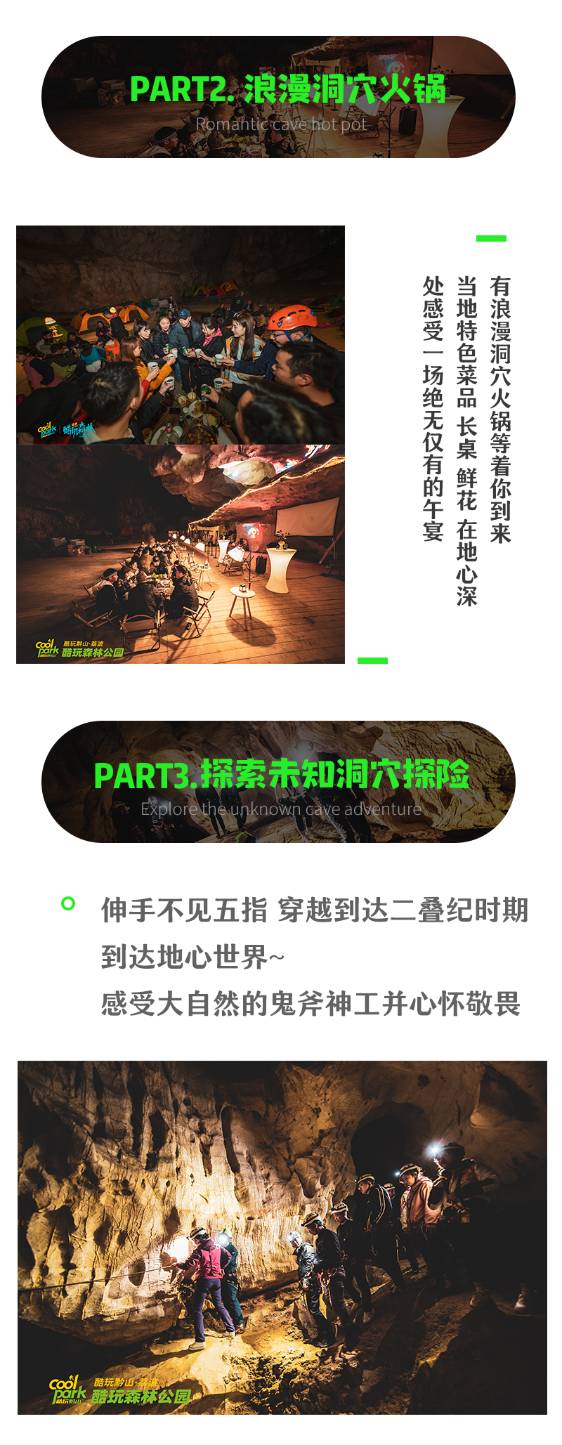 小环线体验项目: 1. 溜索进洞; 2. 洞穴火锅; 3. 地质科普介绍; 4. 黑暗冥想; 5. 垂直酷跳 (跳楼机) 6.探洞证书及化石