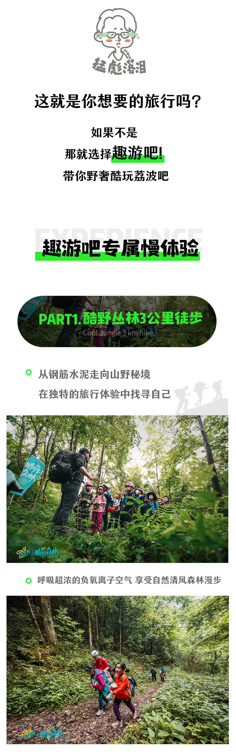 带您体验3.5公里丛林徒步,感受天蓝和翠绿相撞,呼吸着超浓的负氧离子空气,伸手就可享受自然清风,触摸参天大树,没有沾染一丝浑浊,山野游荡中找寻自己。