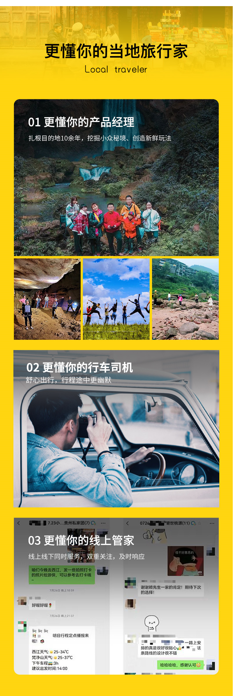 下单后,出发前一天22点前会有师傅联系您,约定好出发时间! 产品经理有话说: 趣游吧专注于精致小团,深挖贵州专注品质旅行与玩法创新,是更懂你的当地旅行家,提供目的地体验、高质量主题旅行的产品。